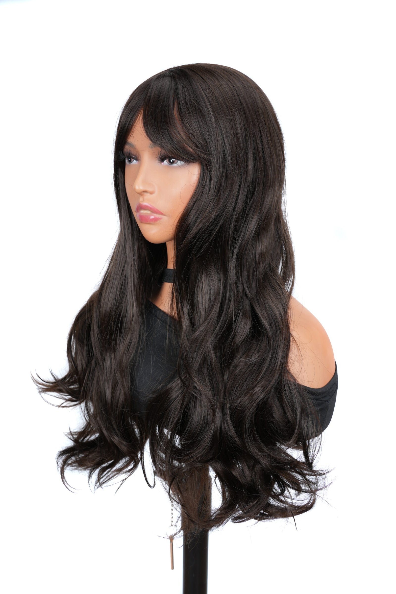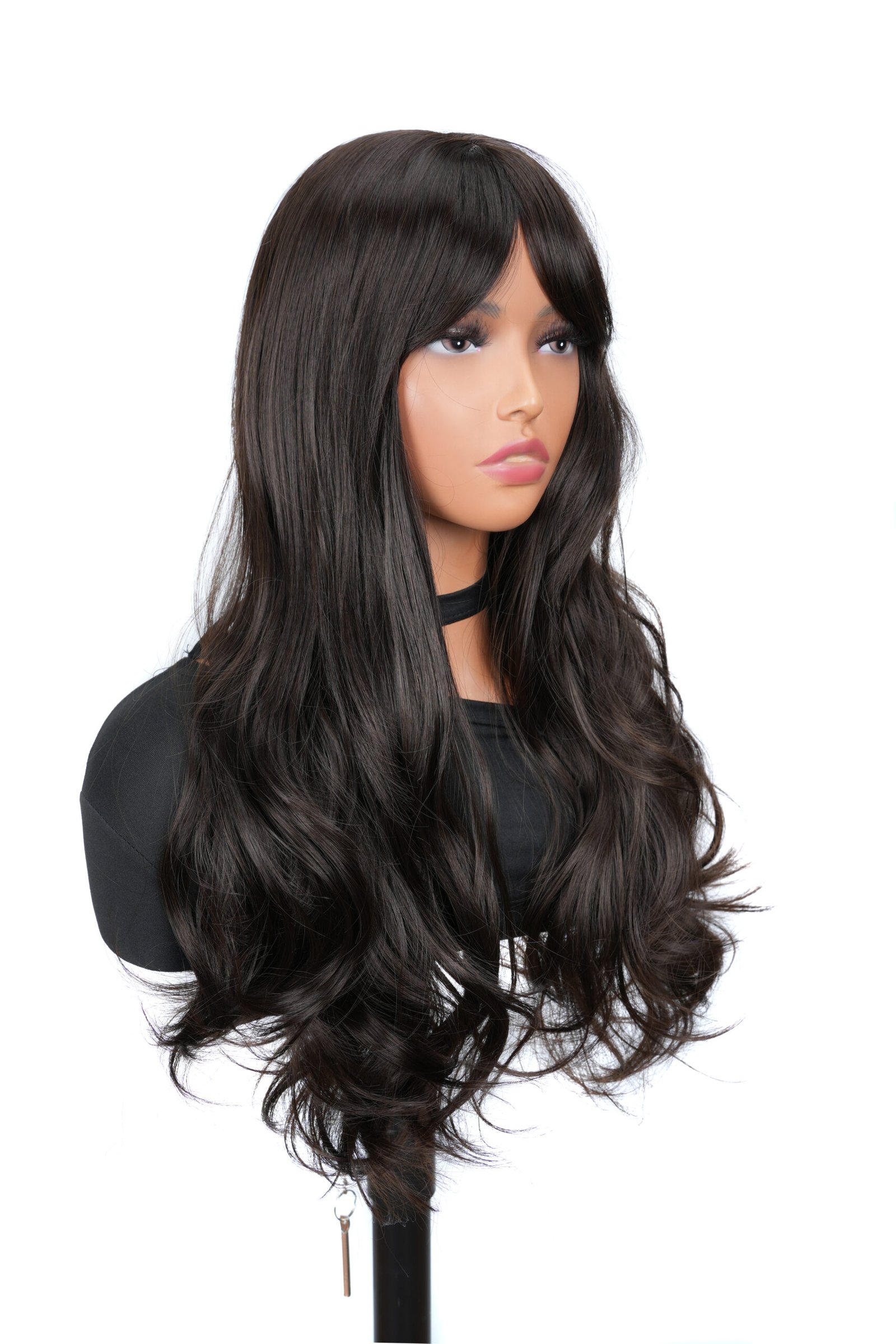 The Natural Black Body Wave Wig with Bangs is a stylish accessory for a quick transformation. Featuring a middle parting and body waves, it exudes a classic elegance. Made from quality synthetic fibers, it offers the feel of real hair. Its adjustable cap ensures comfort. Perfect for all occasions, it gives an effortless, natural-looking hairstyle with just the right amount of volume.